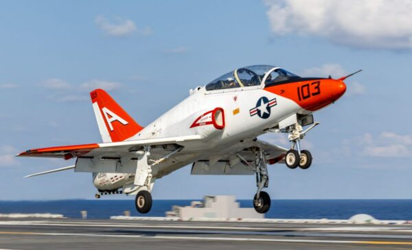 Действующий T-45 — это палубная версия британского BAE Systems Hawk, адаптированная для авианосцев — один из немногих учебных самолетов в мире с такой возможностью.